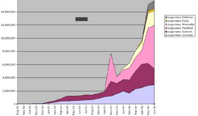Very interesting comment from Nick above. I think what he’s saying is that up until June, if I went to Gizmodo or Wonkette or Fleshbot and did a search, the results would be served on Gawker, and count as a Gawker pageview. What I think this means is that the April and May Gawker numbers can be considered exaggerated, and the June numbers more accurate. In other words, the June numbers are LESS dodgy, not more, than the previous months’.